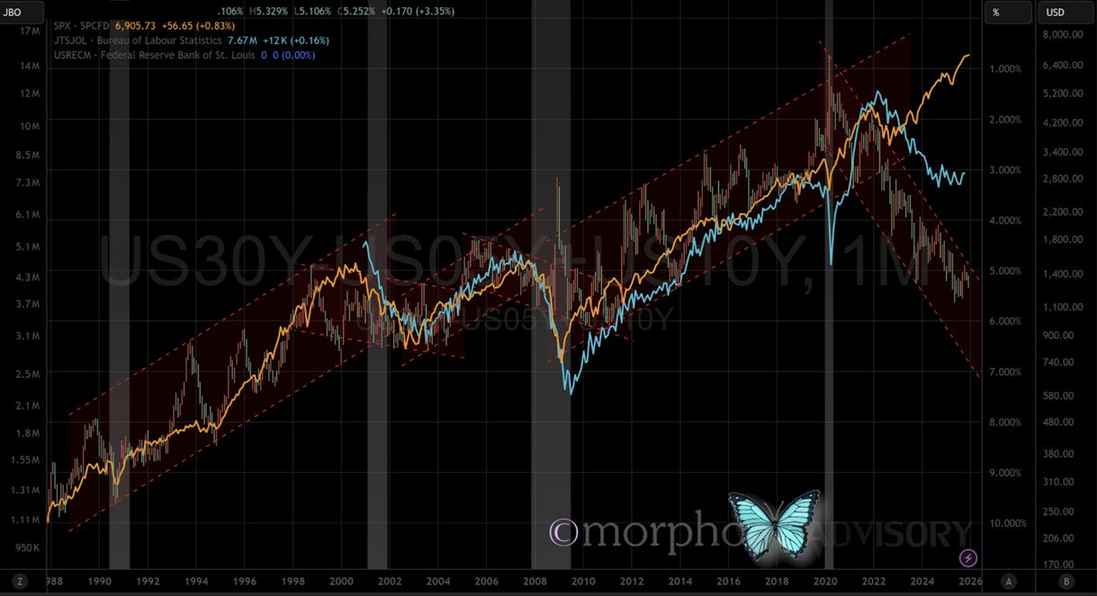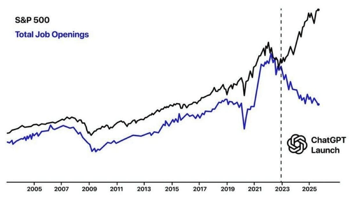 That Substack post was a challenge to the prevailing narrative that went along with the following chart, which implied that the U.S. stock market was diverging from U.S. job openings because ChatGPT (and AI, generally) had disrupted the economic order. People were only too happy to pick it up an run with it because it said what they wanted to hear.